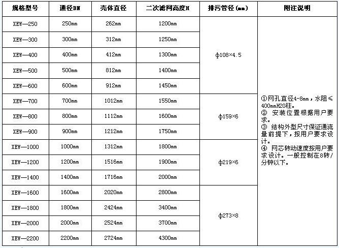 ①網(wǎng)孔直徑4-8mm,水阻≤400mmH2O柱。 ② 安裝位置根據(jù)用戶要求。 ③ 結(jié)構(gòu)外型尺寸保證通流量前提下,按用戶要求設(shè)計。 ④ 網(wǎng)芯轉(zhuǎn)動速度按用戶要求設(shè)計。一般控制在8轉(zhuǎn)/分鐘以下。 五、二次濾網(wǎng)安裝及注意事項 1) 二次濾網(wǎng)可臥式或立式安裝在凝汽器循環(huán)水進口管上,也可安裝在循環(huán)水泵出口,其效果相同。還可以根據(jù)用戶的不同情況另行設(shè)計。 2) 二次濾網(wǎng)進水?dāng)U容段的直徑應(yīng)大于循環(huán)水管道直徑。 3) 安裝尺寸可根據(jù)用戶的現(xiàn)場情況確定。必須要有地面基礎(chǔ)緊固。 4) 二次濾網(wǎng)與凝汽器循環(huán)水管連接方式采用法蘭連接,并在二次濾網(wǎng)與凝汽器之間加裝補償節(jié),便于檢修裝拆和補償之用。 5) 安裝后,須清除濾網(wǎng)前循環(huán)水管中的一切雜物,投運前,并作運行試驗。 六、二次濾網(wǎng)定貨須知 1、 需方提供安裝方案(立式安裝、臥式安裝、垂直90度安裝)、接管通徑根據(jù)需要方提供安裝尺寸或原二次濾網(wǎng)圖紙進行設(shè)計。 2、 用戶有特殊環(huán)境,我公司將派人現(xiàn)場勘察另行設(shè)計。
